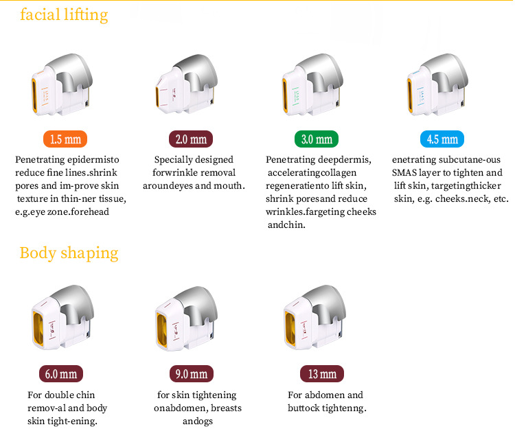 With 7 different cartridges, High Intensity Focused Ultrasound accuratelydelivers heat energy to deepskin layers ofdifferent depths to stimulate collagenregeneration to increase skin elasticity, improve skintexture and reduce sagging skin,achieving the results of wrinkle removal, skin lifting and tightening, etcfor both faceand body, lt can also target subcutaneous tissues to selectively destroy localized fatcelsbeneath the surface skin layer without harming surrounding tissues meanwhilepromoting skinmetabolism and blood circulation, so as to realize the effects of bodyslimming, abdomen frming, buttockand breast lifting, etc.